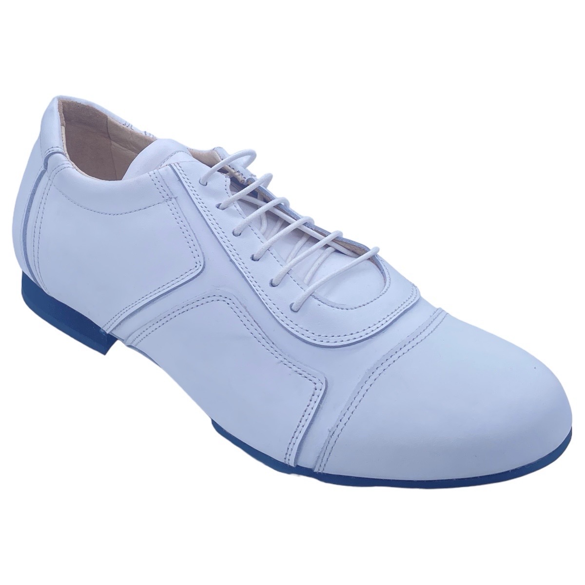 Aufwendiger Dance Sneaker in weissem Kalbsleder, weich gepolstert - Leder pflanzengefärbt und weich - griffige Wildledersohle. Dieses Modell findet seinen Einsatz in allen Tanzbereichen, tanz mit ihm Tango, Salsa oder in der Tanzschule Latein- oder Standardtänze (Practice) - er ist sportlich, kann aber durchaus noch zu einem modernen Anzug durchgehen da er vom Aufbau eine geteilte Sohle hat wie ein Sneaker - von oben aber nur semi-sportlich wirkt
