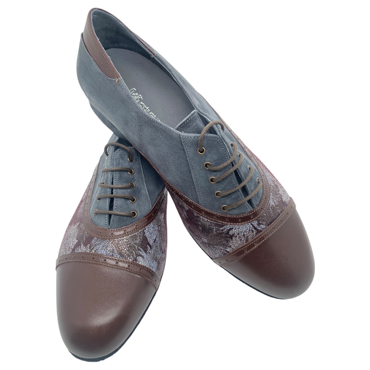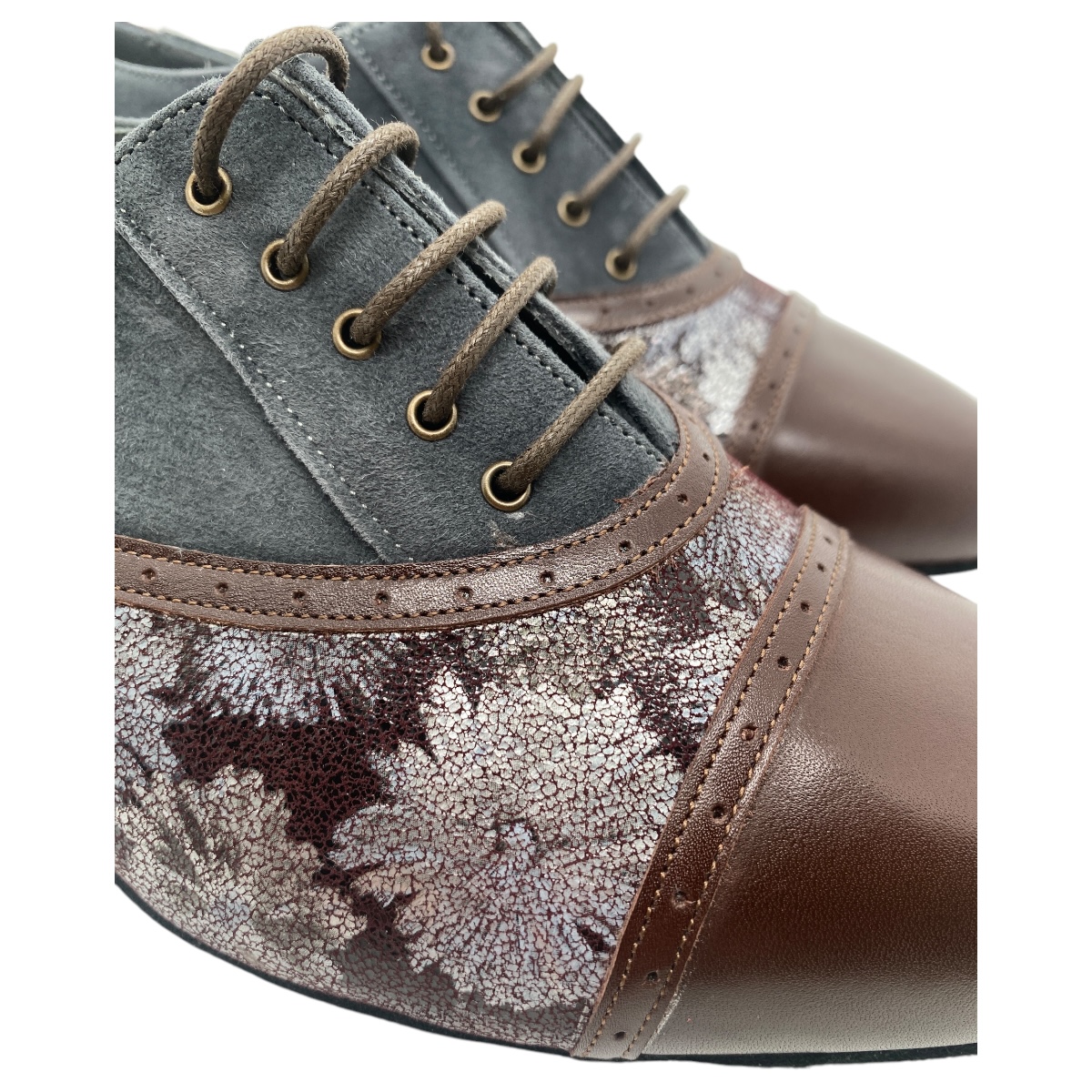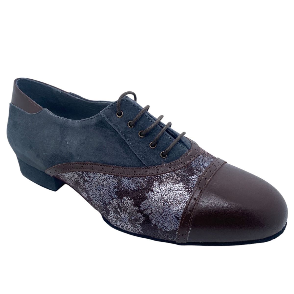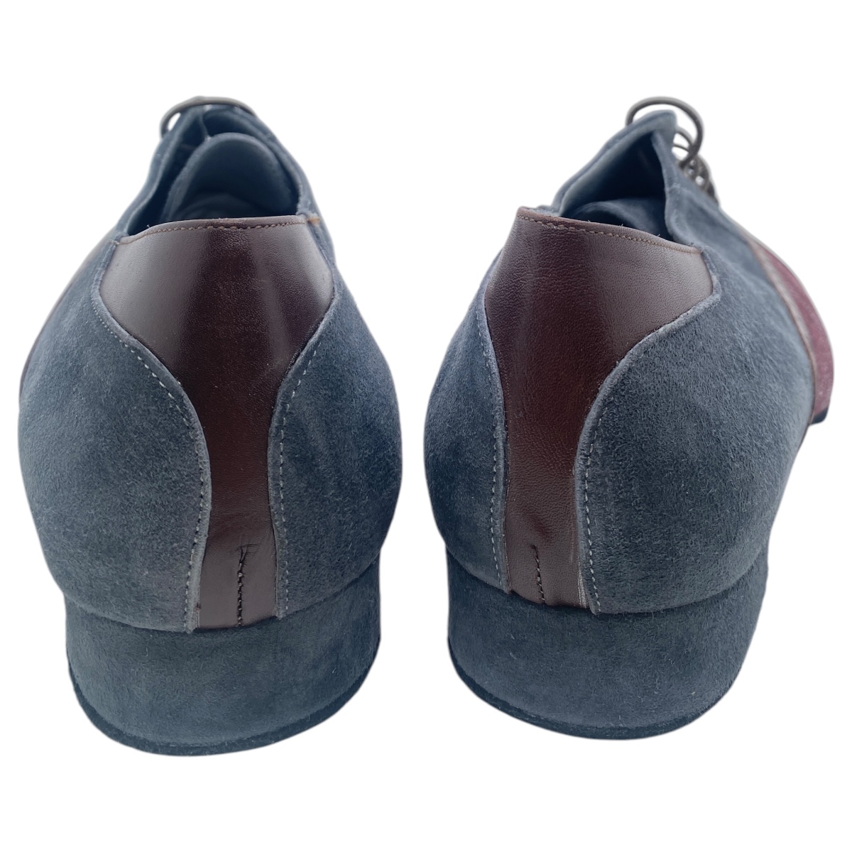 Herrenschuh in weichem Wildleder in einer Kombination von blau und grau mit grauen Nappapaspeln mit Lochverzierung. Flacher 20 mm Absatz und innen weich gepolstert. Giftfrei und schonend zur Umwelt gefärbt. Schnürriemen gewachst. Ein toller Tangoschuh oder für Salsa .. aber auch ein toller Tanzschuh für die Tanzschule.