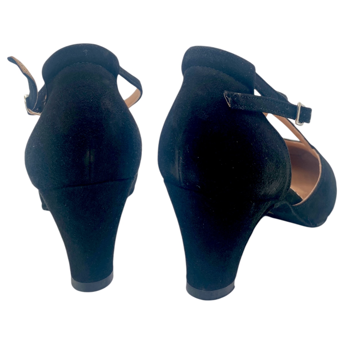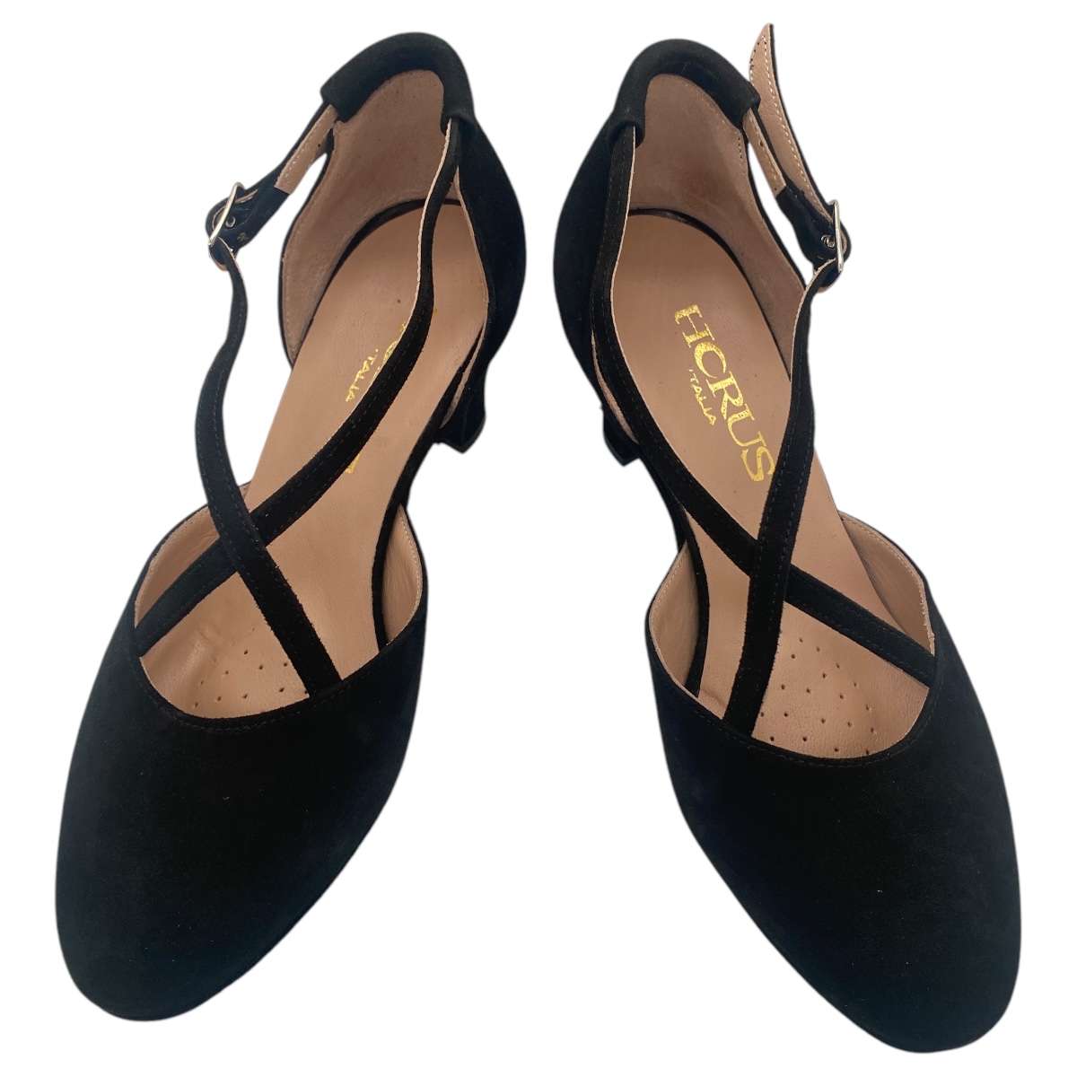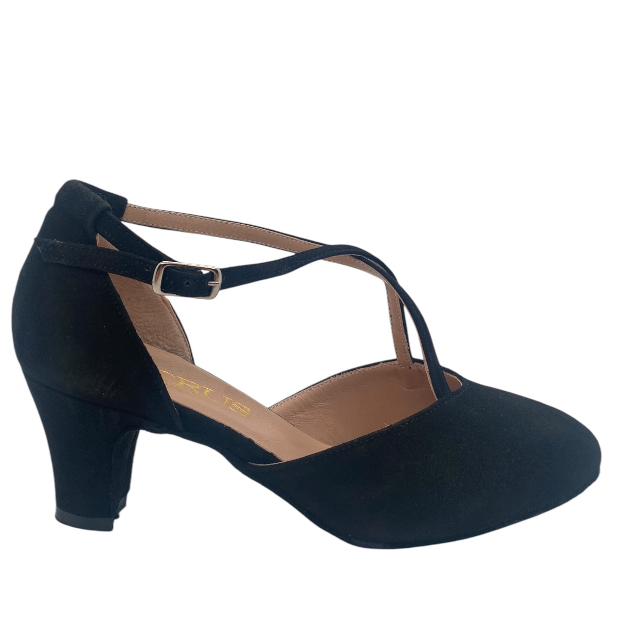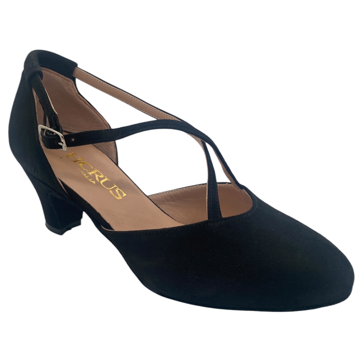 Weicher Basic Damentanzschuh aus schwarzem Velourleder mit 50 mm Absatz und gekreuztem Riemchen über dem Spann, schön gepolstert mit weicher griffiger Velourledersohle aus italienischer Fertigung