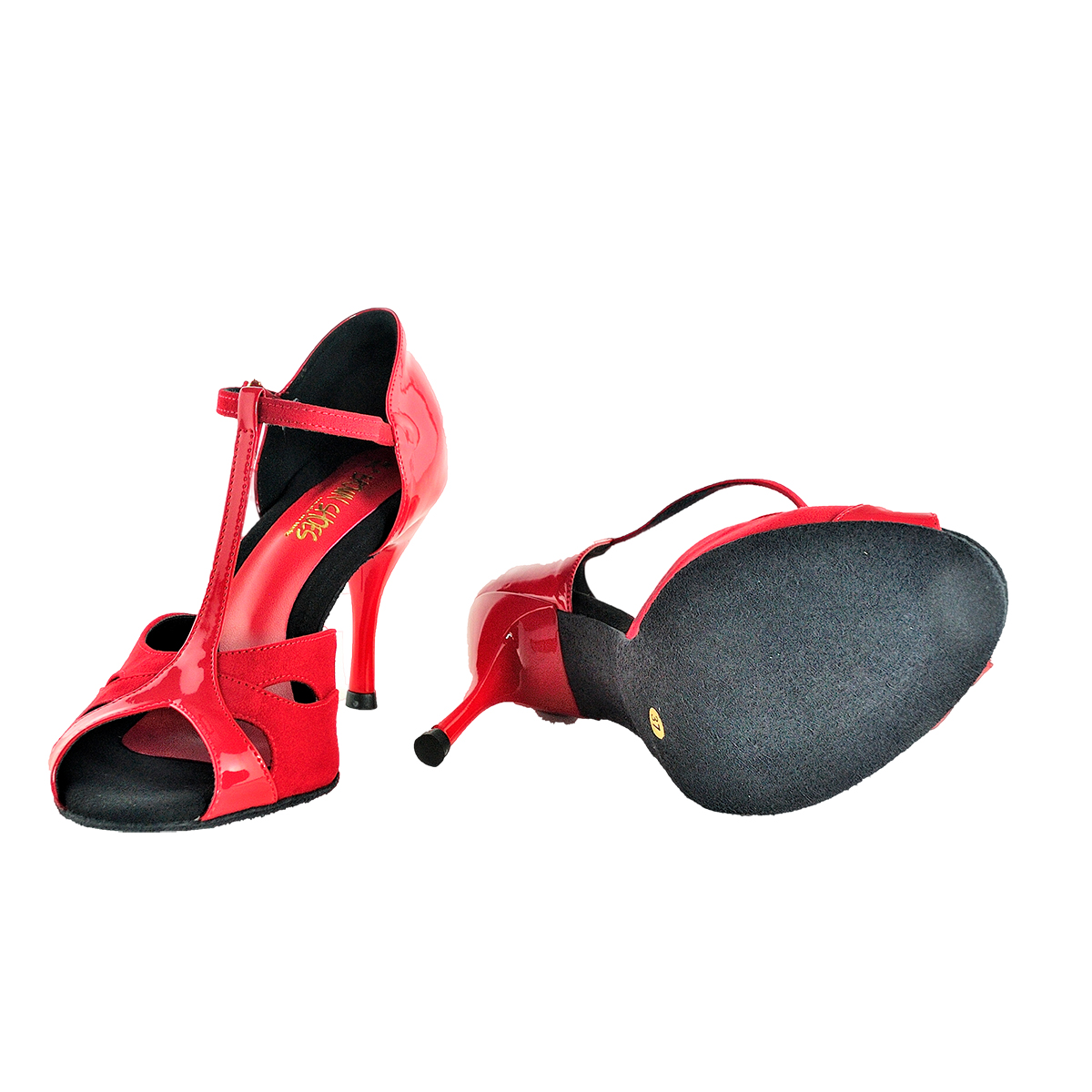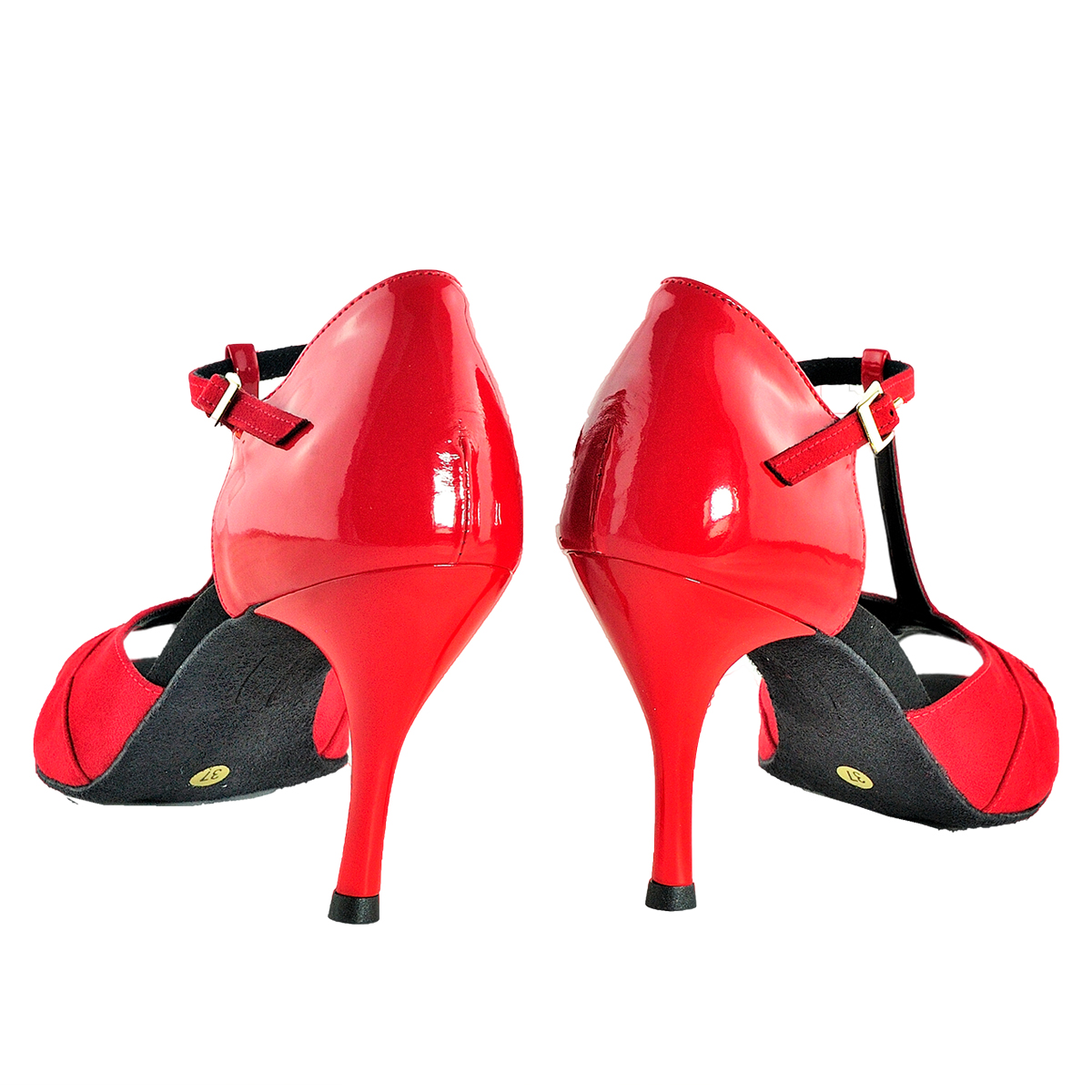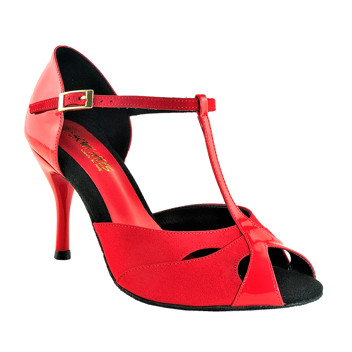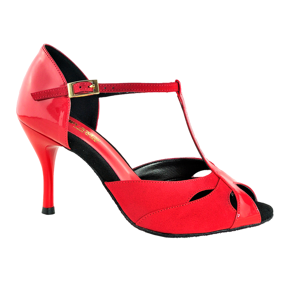 Charlotte, die "Lady in Red" hätte sie geliebt .. Modell Charlotte, aus der veganen Serie Mr. & Mrs. Brown. Kräftiges Rot in künstlichem Wildleder und Lack mit der extra entwickelten Mikrofasersohle, nachhaltig, da länger haltbar als Wildleder, einfacher zu pflegen (diese Schuhe rauht man nicht mit der sonst üblichen Aufrauhbürste für Tanzschuhe auf sondern mit der Pflegebürste mit weichem Metallhaar, die sicher jeder in seiner Schuhputzkiste finden kann. Auch setzen sich die Sohlen nicht so schnell mit Schmutzpartikeln zu. 85 mm lackierter Absatz in rot geben diesem Modell den tollen Look, kleine Zehenöffnung - leider nicht für breite Füße aber mit toller Statik und gut abgepolsterter Innensohle, farblich angepasst, atmungsaktiv und antibakteriell.