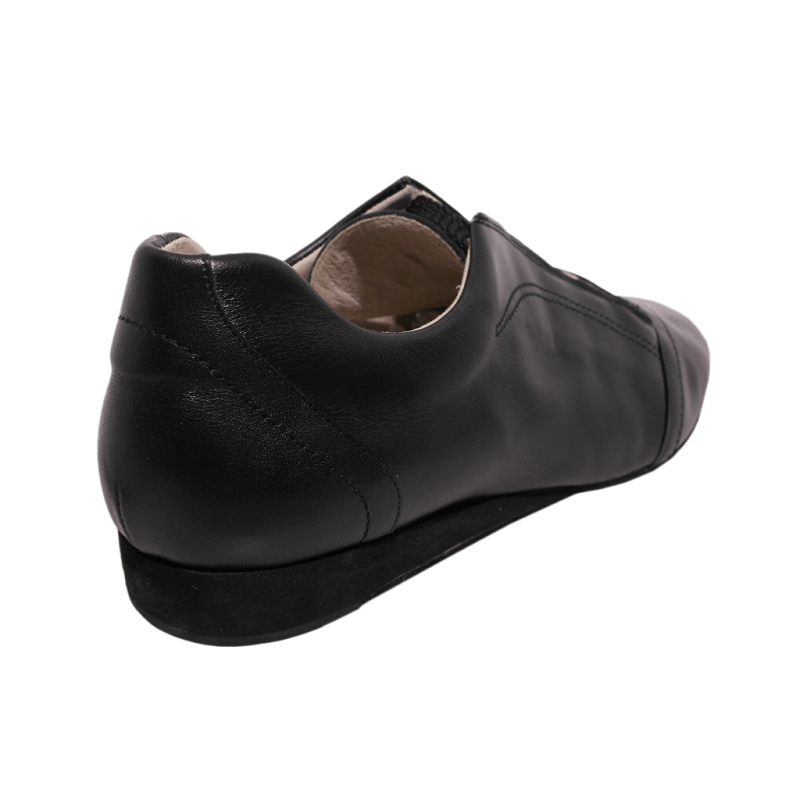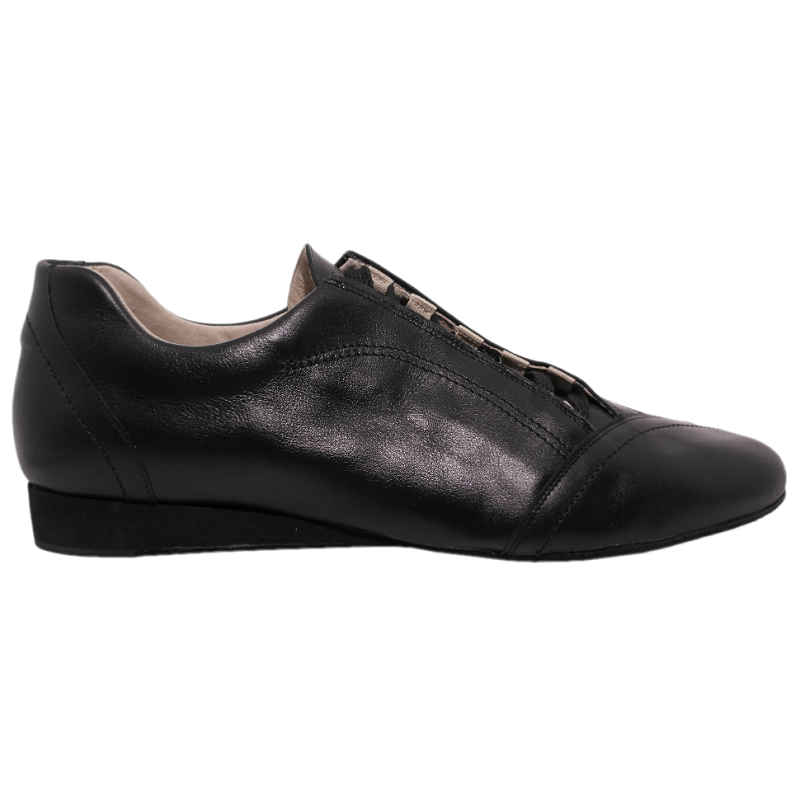 Etwas breiter geschnittener Tanzschuh mit Wildleder-Keilsohle aus schwarzem Nappaleder mit leicht asymetrischer Schnürsenkelführung, beliebt bei Swing- und Linedancern aber auch für die Tanzschule oder Tango Argentino bereits gekauft - auch in uni weiss, rot-weiss oder schwarz-weiss im Shop