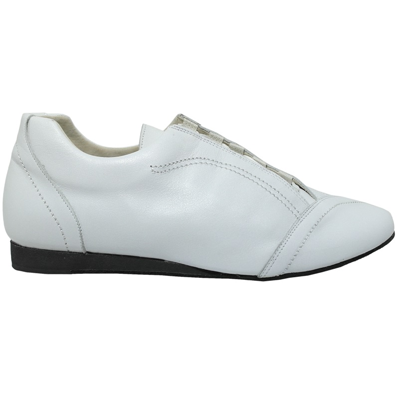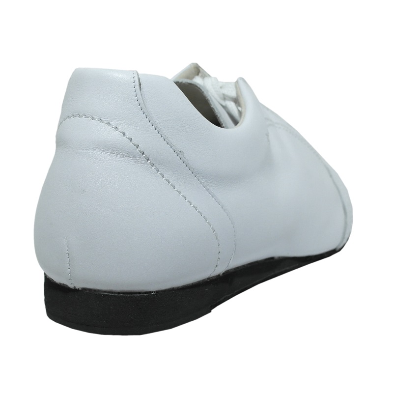 Etwas breiter geschnittener Tanzschuh mit Wildleder-Keilsohle aus weißem Nappaleder mit leicht asymetrischer Schnürsenkelführung, beliebt bei Swing- und Linedancern aber auch für die Tanzschule oder Tango Argentino bereits gekauft - auch in uni schwarz, rot-weiss oder schwarz-weiss im Shop