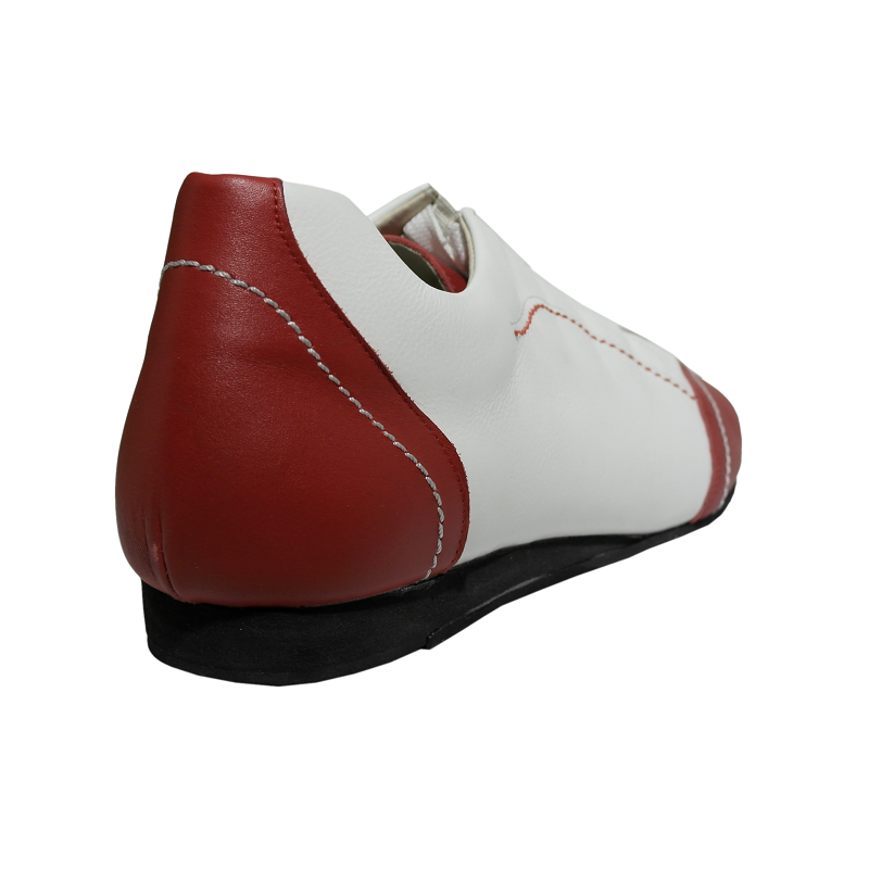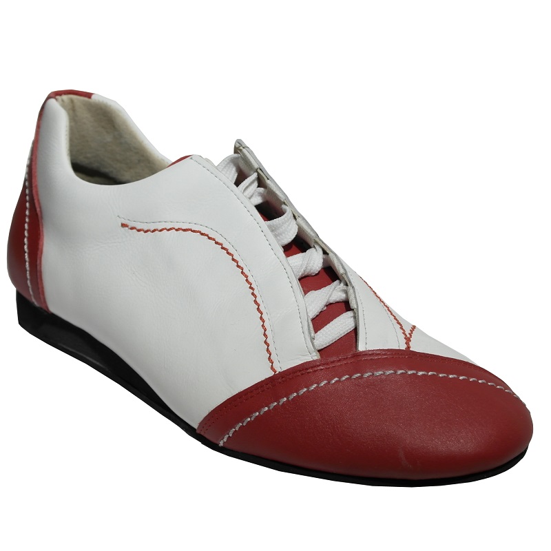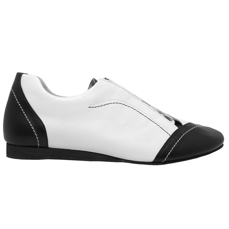 Etwas breiter geschnittener Tanzschuh mit Wildleder-Keilsohle aus schwarzem und weißem Nappaleder mit leicht asymetrischer Schnürsenkelführung, beliebt bei Swing- und Linedancern aber auch für die Tanzschule oder Tango Argentino gerne gekauft - auch in rot-weiss im Shop oder produzierbar (wenn nicht lagernd ca. 4 Wochen Lieferzeit)