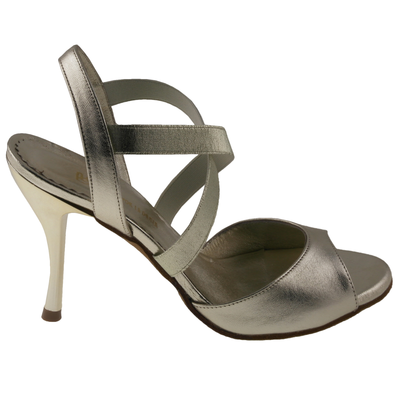 LA TANA in platin - farblich zwischen gold und silber, die elegante Farbe die zu allem passt. Die praktischste Erfindung seit es Tangoschuhe gibt... schnell rein und schnell raus mit den Modellen der "Elasticos"-Serie. Kein lästiges Auf- und Zumachen mehr in der halbdunklen Milonga. In LA TANA schlüpfst Du in Sekunden und verpasst keinen Takt Deiner Lieblingstanda. Hier die Variante /A mit schmalerem Elastik. 80mm oder 90mm Absatz. Die Sohle wie immer extrem gut abgeschäumt mit einer Schäumung mit hoher Dichte. So bleibt sie lange schön stabil, pflanzengefärbt in Europa. Eine griffige Wildledersohle und gute Statik, immer groß geschrieben bei Porteño & Bailarina- hier in weichem, rotem Wildleder mit praktischen Elastikbändern überm Spann gekreuzt - kein lästiges Auf und Zumachen von kleinen Schnallen in dunklen Milongas mehr !! - das Elastik ist haltbar und engt nicht ein. Die Slingferse ist aus rotem Lackleder gefertigt. Achtet darauf, das unsere Absätze mit den Grössen wachsen. Ein Absatz = 80mm wird standardmäßig bei Grösse 37 gemessen. Daher lagern wir die Grössen ab 40 meist nur mit dem 80er Absatz, denn bei 41 wäre dieser schon 85mm hoch. Wir produzieren aber gerne auf Wunsch auch mit einem höheren Absatz.