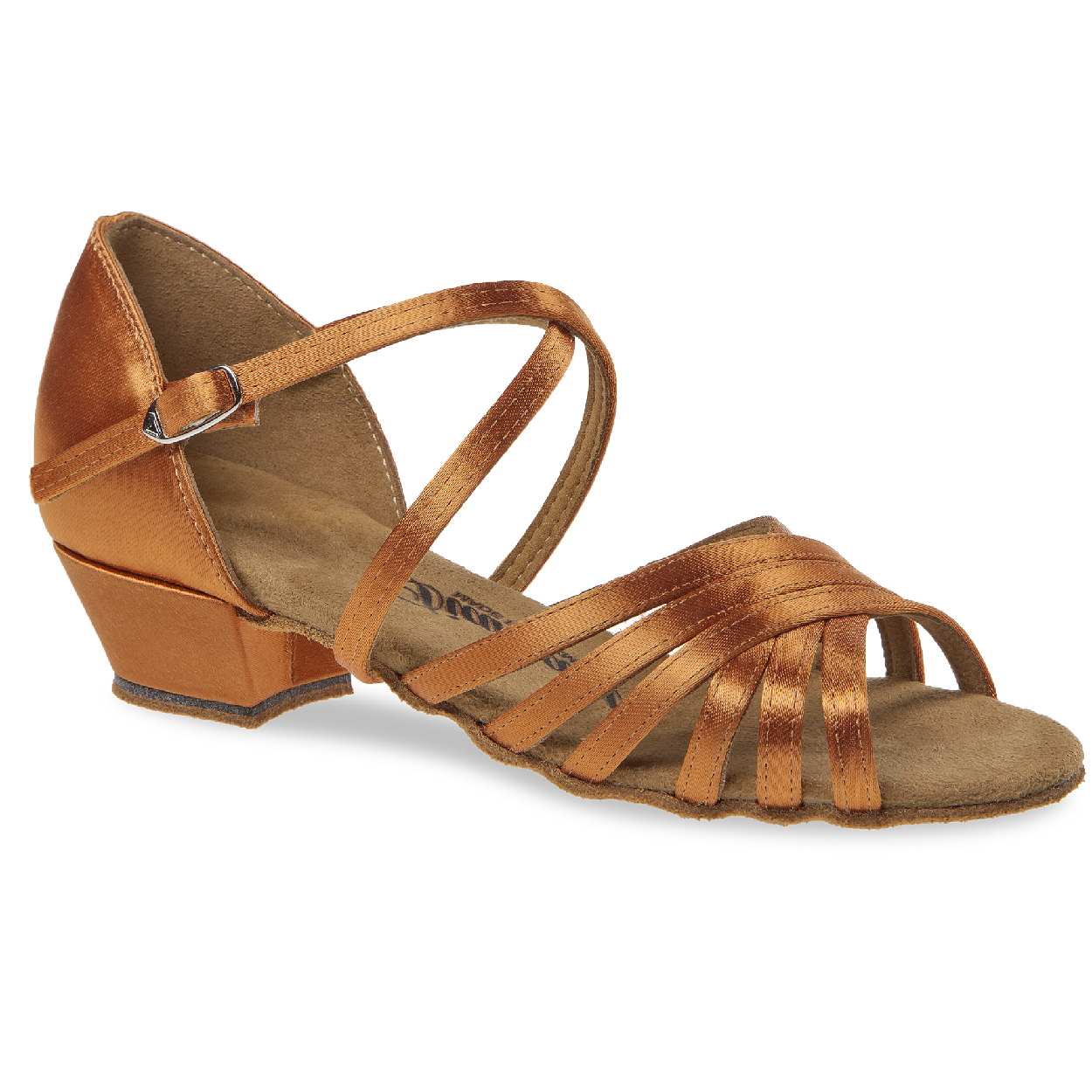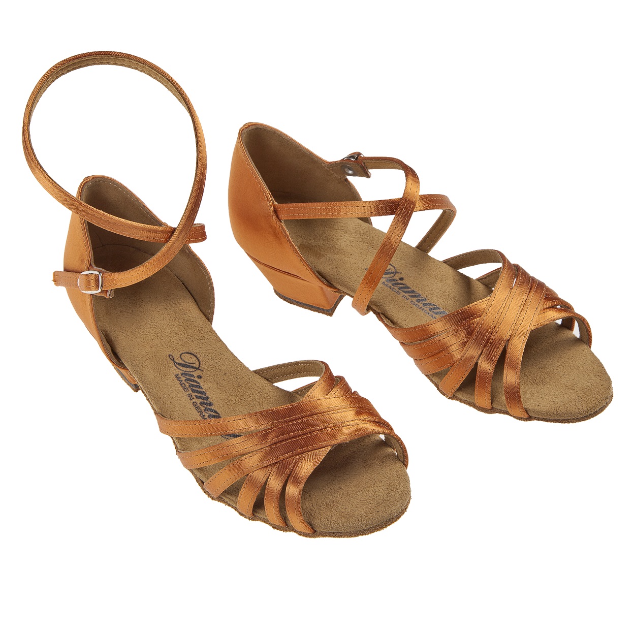 Mod. 196 Diamant Mädchen Tanzschuhe Made in Germany handgefertigt mit einem Vorderblatt aus sechs zu einem Netz vernähten Riemchen die sich dem Fuß anpassen. Die zehenoffene Sandalette wird mit einer stufenlos einstellbaren Druckknopfschnalle zum schnellen Öffnen und Schließen an einem Fersenriemchen gefertigt, welches entweder unter dem Fuß oder um den Unterschenkel verlaufen kann. Dieser Kindertanzschuh für Mädchen wird mit einem Schock absorbierenden 2,5 cm Block Absatz hergestellt. Als Innenauskleidung wird ein atmungsaktives und Feuchtigkeit absorbierendes Microfaser aus italienischer Premium-Herstellung eingearbeitet. Für das Obermaterial aus dark tan Satin wird erstklassiger Stoff aus England verwendet.
