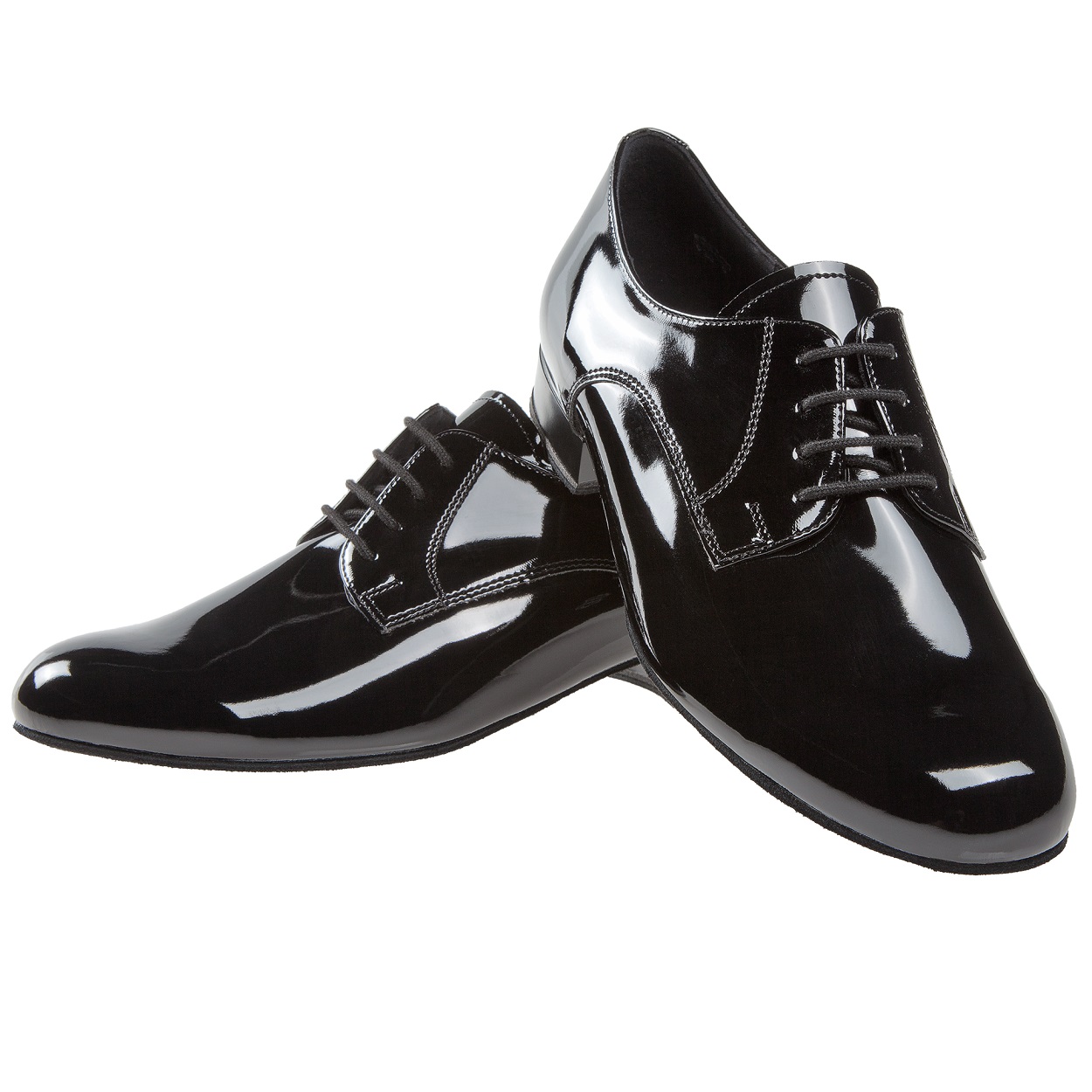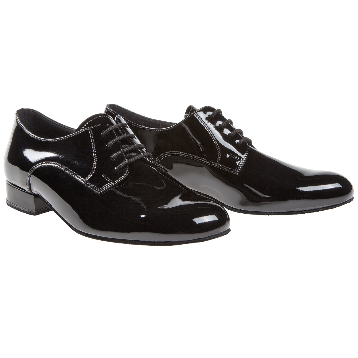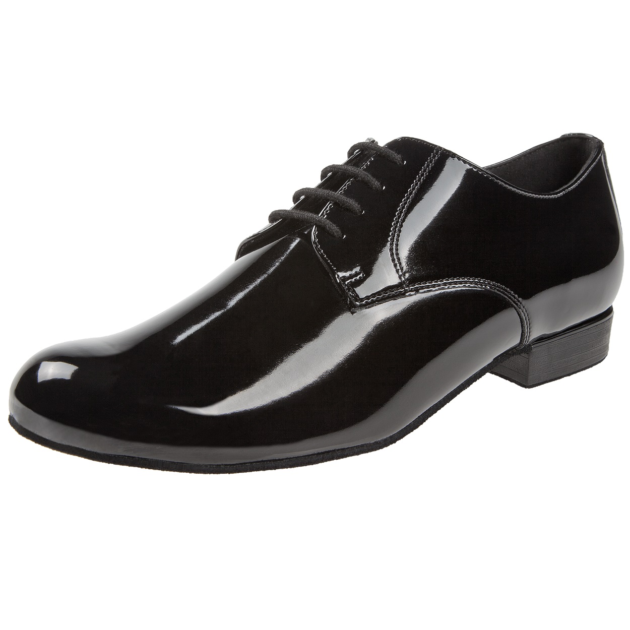 Mod. 179 Diamant Herren Tanzschuhe Made in Germany handgefertigt in klassischer Plain Derby Ausführung mit offener 4-Loch Schnürung. Dieser Tanzschuh wird in der Weite H (bequem) mit einem Schock absorbierenden 2 cm Standard Absatz hergestellt. Als Innenauskleidung wird ein atmungsaktives und Feuchtigkeit absorbierendes Microfaser aus italienischer Premium-Herstellung eingearbeitet. Für das Obermaterial aus schwarz Lack Synth. wird ein hochwertiges Synthetikmaterial aus Italien verwendet.