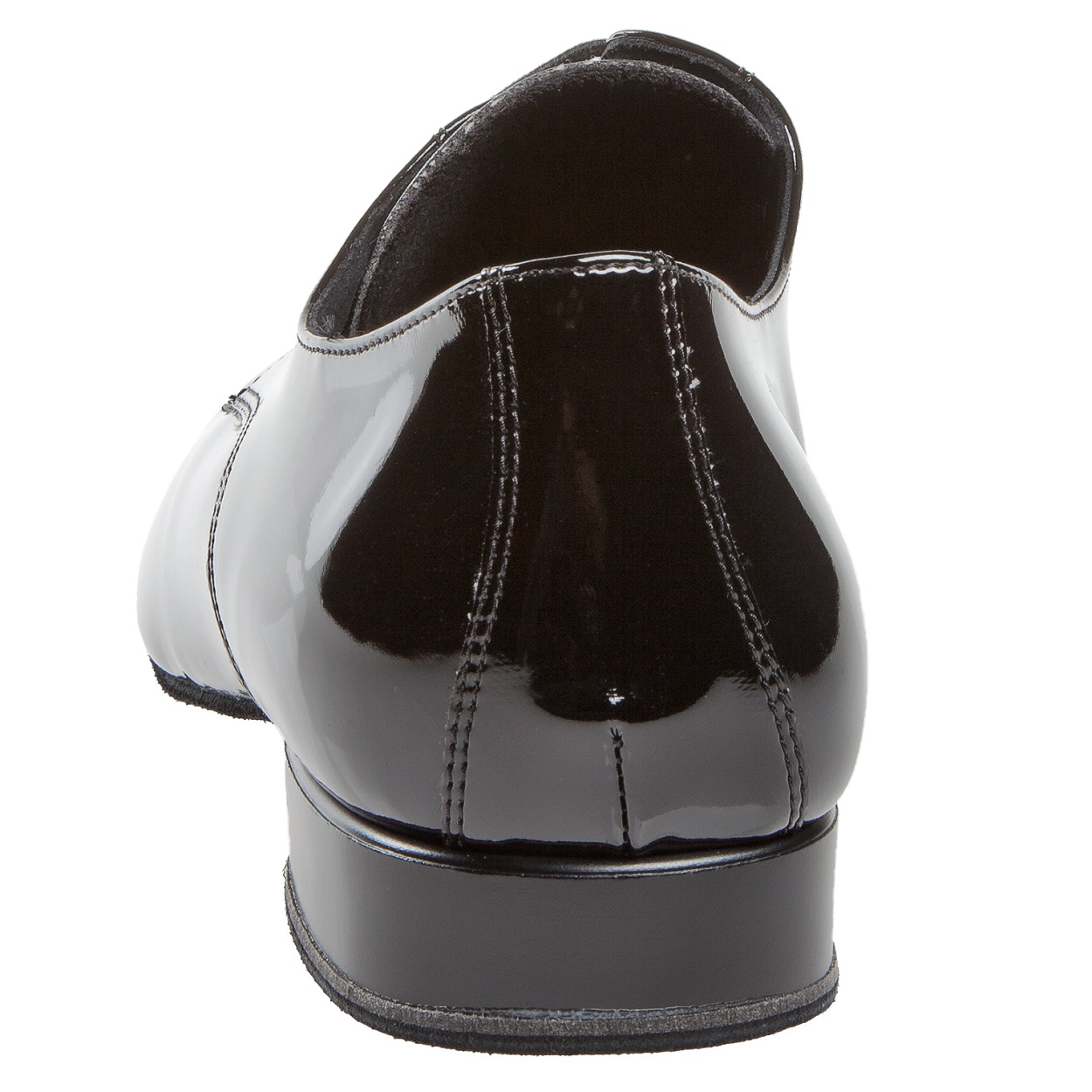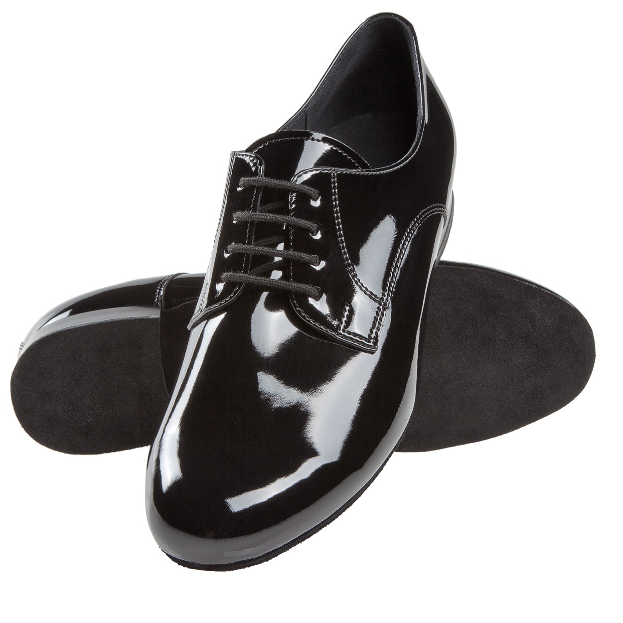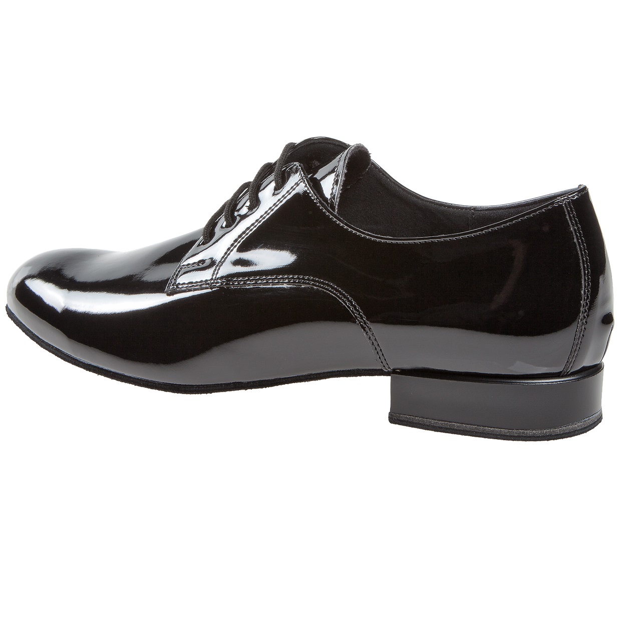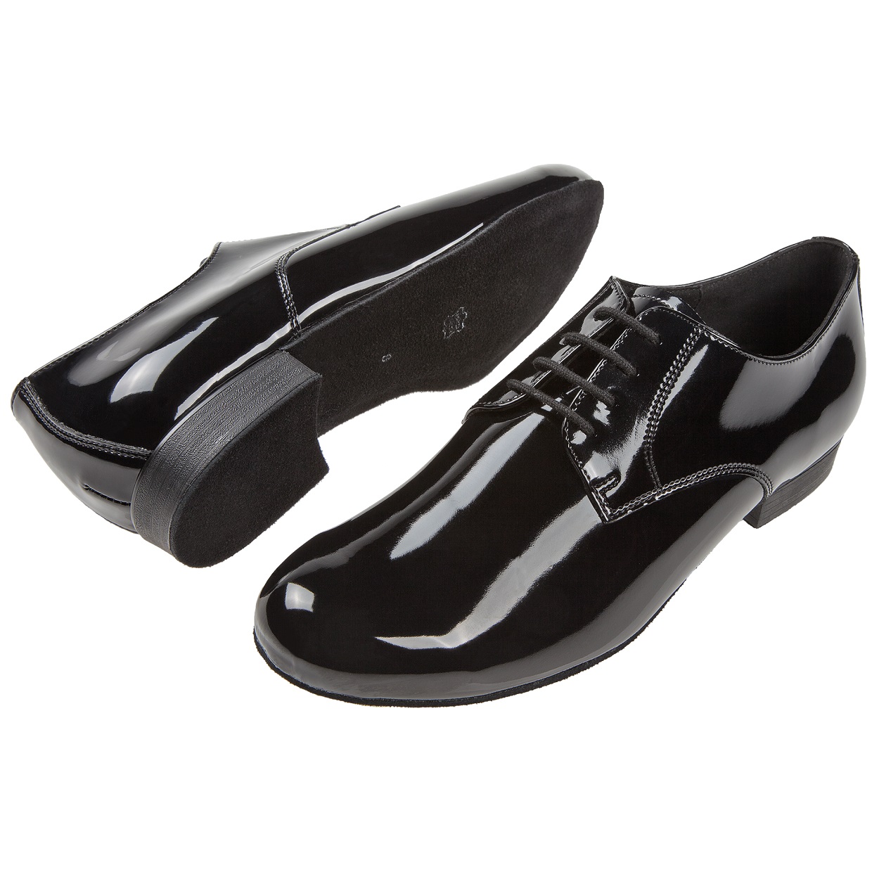 Mod. 179 Diamant Herren Tanzschuhe Made in Germany handgefertigt in klassischer Plain Derby Ausführung mit offener 4-Loch Schnürung. Dieser Tanzschuh wird in der Weite H (bequem) mit einem Schock absorbierenden 2 cm Standard Absatz hergestellt. Als Innenauskleidung wird ein atmungsaktives und Feuchtigkeit absorbierendes Microfaser aus italienischer Premium-Herstellung eingearbeitet. Für das Obermaterial aus schwarz Lack Synth. wird ein hochwertiges Synthetikmaterial aus Italien verwendet.