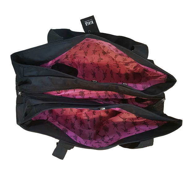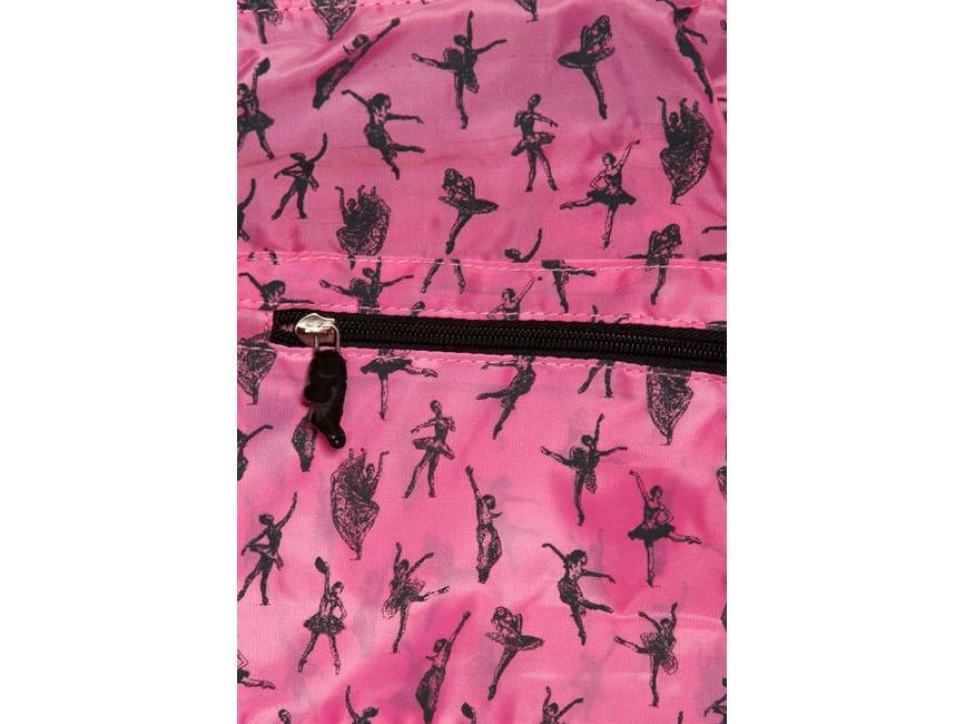 Diese Stofftasche ist ein absoluter Bloch Favorit! Sie hat mehrere Fächer und ist auf der Vorderseite mit dem Farblosen "Bloch for Dancers" Logo bedruckt. Die Innenseite der Tasche verfügt über ein schwarzes und rosanes Muster welches den Umriss einer Tänzerin abbildet und welches der Tasche einen Spritzer Farbe gibt.