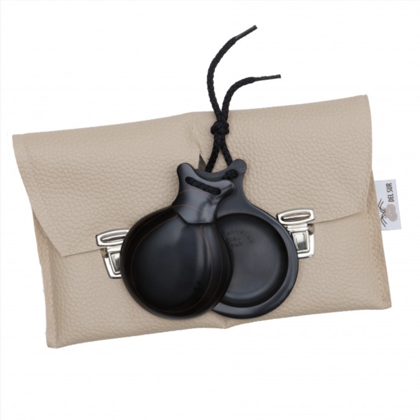 Professionelle Kastagnetten in Handarbeit hergestellt, laminiert und mit Harz versiegelt, reiner und sauberer Klang, von Hand geschliffen und definiert. Hergestellt in der spanischen Manufaktur Castañuelas Del Sur - Maße: 9,2 cm x 7 cm (Gr. 5 = grössere Größe) - die Manufaktur empfiehlt diese Kastagnettengröße für Damen - wir finden Sie jedoch noch einen Hauch zu groß für kleine Damenhände. Eher für große Damenhände und kleine Männerhände. Die Kastagnetten kommen in einer schwarzen Kunstlederhülle, das Etui hat zwei Fächer, mit Plüsch ausgefüttert zur schonenden Aufbewahrung.