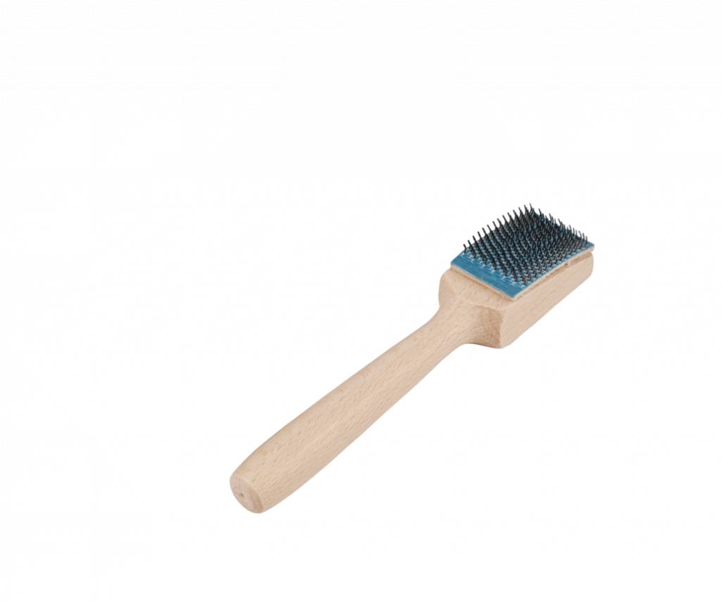 Aufrauhbürste für Wildledersohlen mit Holzgriff in Kunststoffhülle. Entfernt Schmutzpartikel und Wachsreste, die sich im Floor der Wildledersohlen festgesetzt haben. Irgendwann stellt man fest, das die Wildledersohlen rutschig werden, - dies kann neben einer langen Nutzungsdauer auch mit eingetretenen Staub- und Schmutzteilchen zu tun haben. Die harten Metallhaare kämmen den Schmutz heraus und die Sohlen werden wieder griffig.