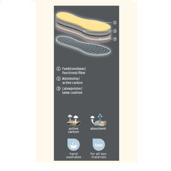 Die hygienischen Einlegesohlen mit Aktivkohle für aktive Menschen und frische Füße: Beugen Fußgeruch vor und polstern den Fuß für entspanntes und weiches Gehen.